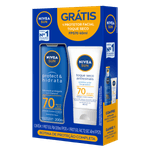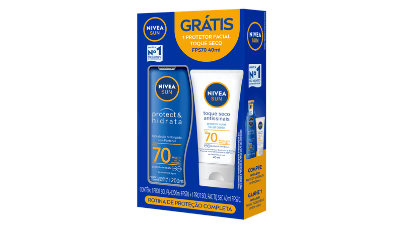Protetor Solar Nivea Sun Protect & Hidrata FPS70 + Nivea Sun Facial Toque Seco Antissinais FPS70 foi criado para quem busca proteção solar completa e eficaz todos os dias. Com FPS 70, oferece defesa muito alta contra os raios UVA e UVB, ajudando a prevenir queimaduras solares, manchas e danos causados pela exposição ao sol. É o cuidado essencial para aproveitar o dia com tranquilidade, seja na praia, piscina ou na rotina urbana.